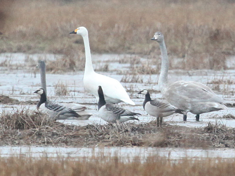 | 02.01.2012. Tundra Bean Goose (Anser serrirostris) 41, Greater White-fronted Goose (Anser albifrons) 1, Barnacle Goose (Branta leucopsis) 8 at Uzava river floodplain fields, Ventspils county (K.Millers). All goose species rare in winter months. Tundra Swan (Cygnus columbianus) 150, Whooper Swan (Cygnus cygnus) ~860 at Uzava river floodplain fields, Ventspils county (A.Klepers et al.). Late winter migrant records or potential wintering birds and largest number at wintering place. Eurasian Wigeon (Anas penelope) 2 MM at Uzava river floodplain fields, Ventspils county (A.Klepers et al.). Merlin (Falco columbarius) 1 at Uzava river floodplain fields, Ventspils county (A.Klepers et al.). Lapwing (Vanellus vanellus) 62 at Ziras, Ventspils county (A.Klepers et al.). 7th record in January. European Golden Plover (Pluvialis apricaria) 25 at Uzava river floodplain fields, Ventspils county (A.Klepers et al.). 3rd record in January. Horned Lark (Eremophila alpestris) 4 at Uzava river floodplain fields, Ventspils county (A.Klepers et al.). 5th record in winter months. Mistle Thrush (Turdus viscivorus) 1, Twite (Carduelis flavirostris) 3 at Uzava river floodplain fields, Ventspils county (A.Klepers et al.).