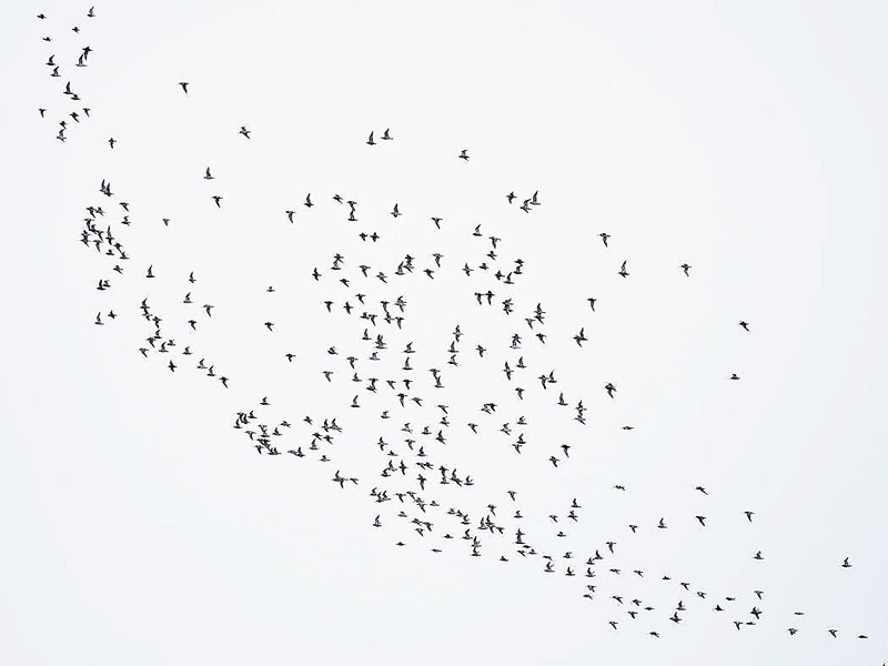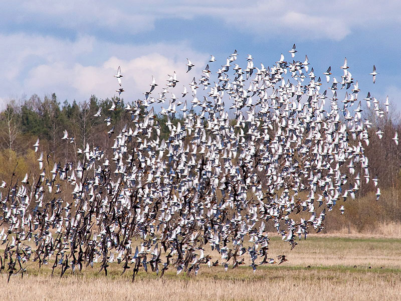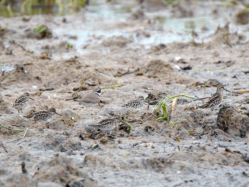 19.05.2020. Šinca šņibītis (Calidris alpina schinzii) 1 kopā ar 14 parastajiem šņibīšiem (Calidris alpina) pie Mangaļsalas mola, Rīga (I.Deņisovs).